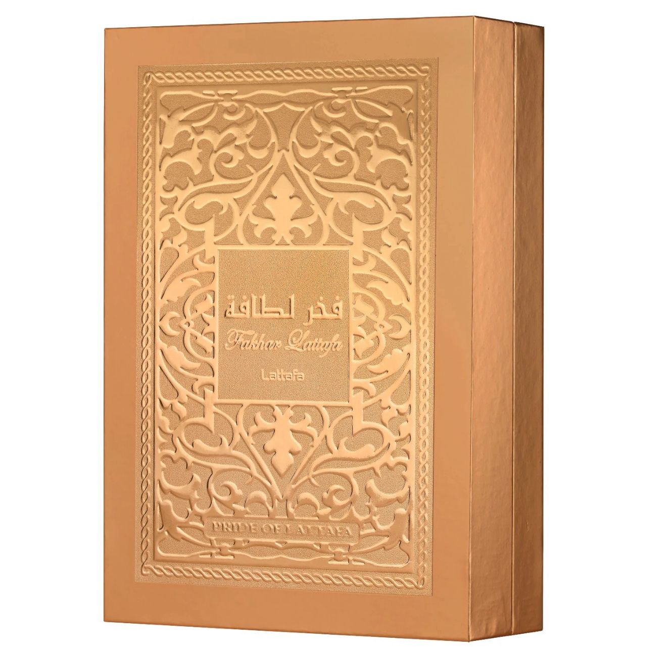 FAKHAR GOLD EXTRAIT è un'eau de parfum orientale fougère che cattura l'essenza della sofisticatezza maschile. L'apertura vivace di pompelmo, cardamomo e pepe rosa cede il passo a un cuore elegante dominato dalla tuberosa, dalle note solari e dall'artemisia, che conferiscono profondità e carattere. La base ricca di ambra, cashmeran, cuoio e labdano assicura una permanenza straordinaria e un'evoluzione affascinante sulla pelle. Questa composizione stratificata rappresenta la scelta ideale per l'uomo che desidera una fragranza versatile, capace di transitare con grazia da momenti diurni a serate raffinate, mantenendo sempre un'aura di distinzione e magnetismo.