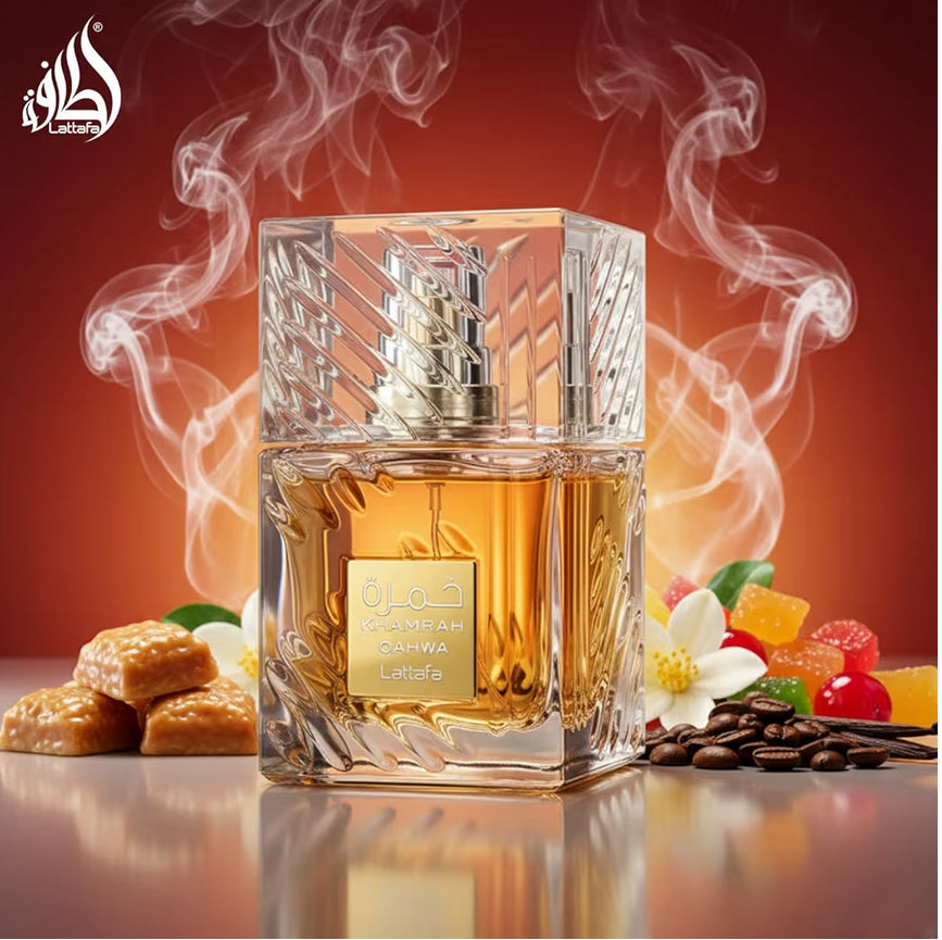 • Le note di fondo sono costituite da una ricca miscela di vaniglia, caffè intenso, fava tonka dolce, benzoino resinoso e muschio. Questo aggiunge calore e sensualità di lunga durata alla fragranza. Khamrah Qahwa è un profumo complesso e unico.